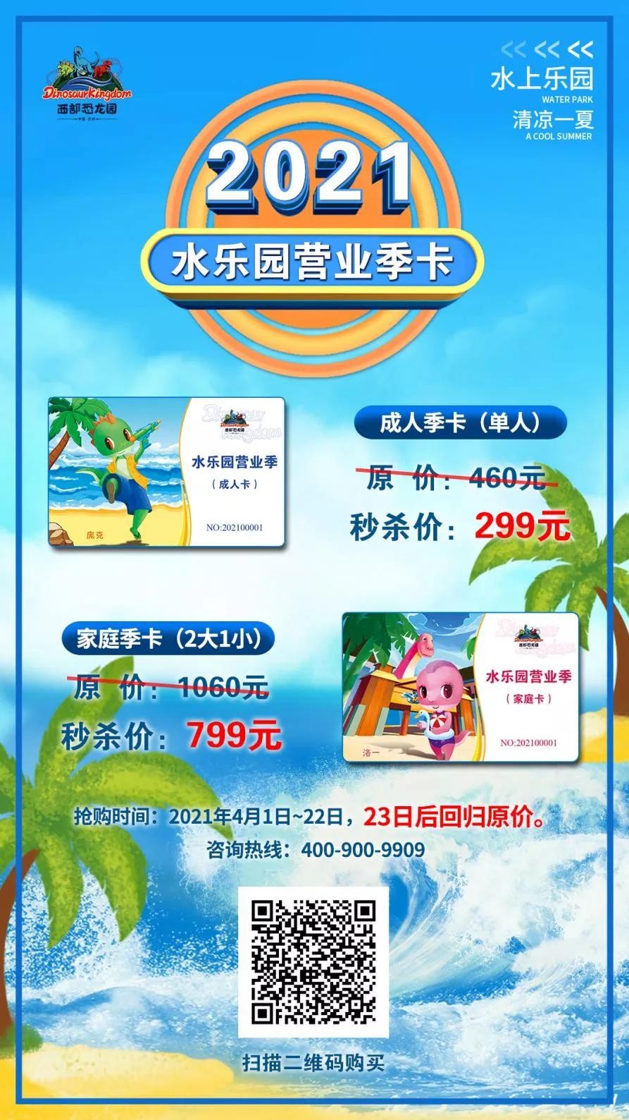 2021年4月1日-4月22日期间扫码购买西部恐龙水乐园2021营业季卡,4月23日-10月8日期间不限次数畅玩水乐园。