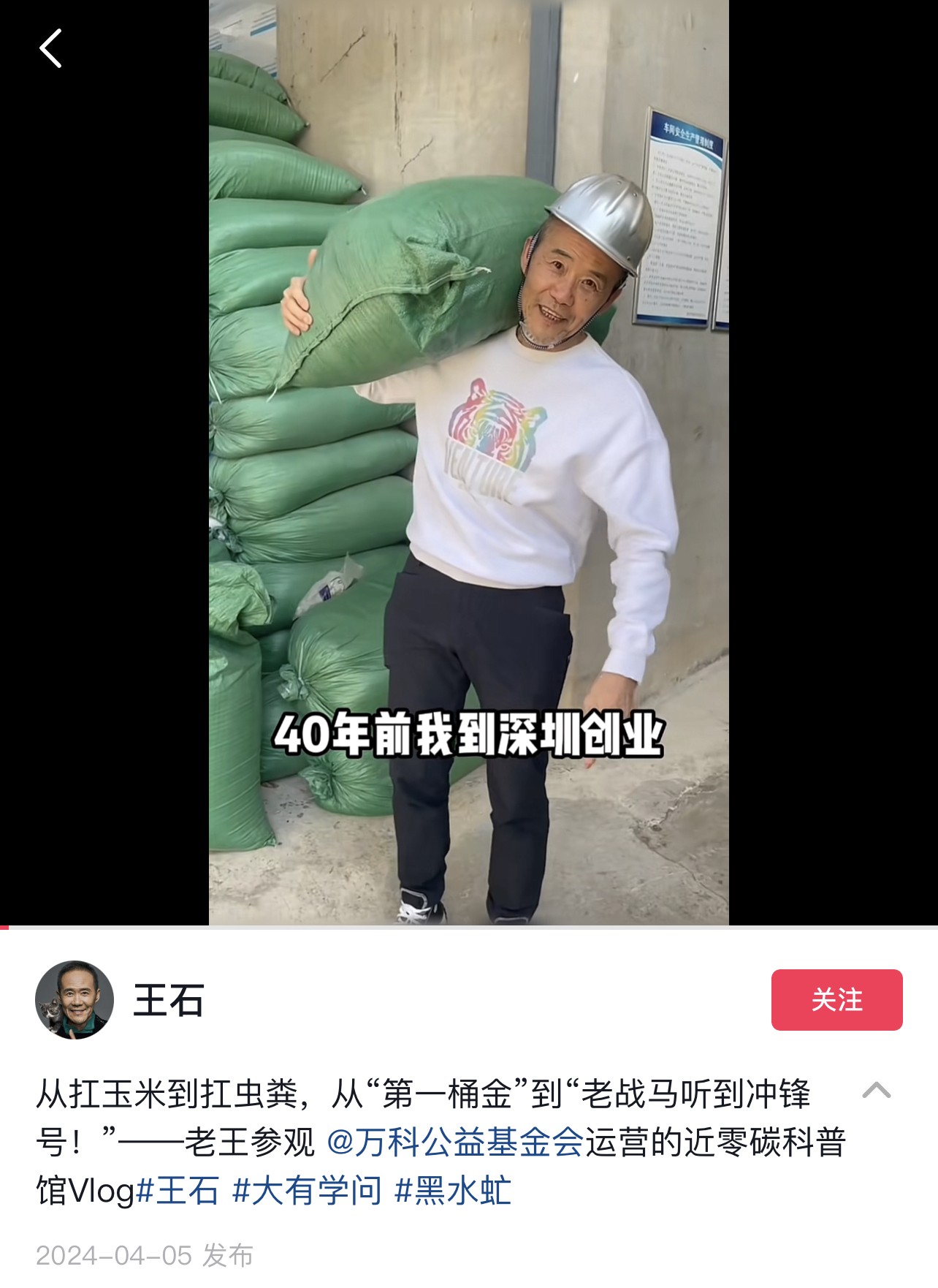 王石一直在为公益事业做贡献,4月5号的时候,还在社交平台发表了视频,扛着一大袋的重物却丝毫不显疲惫,身体倍棒。