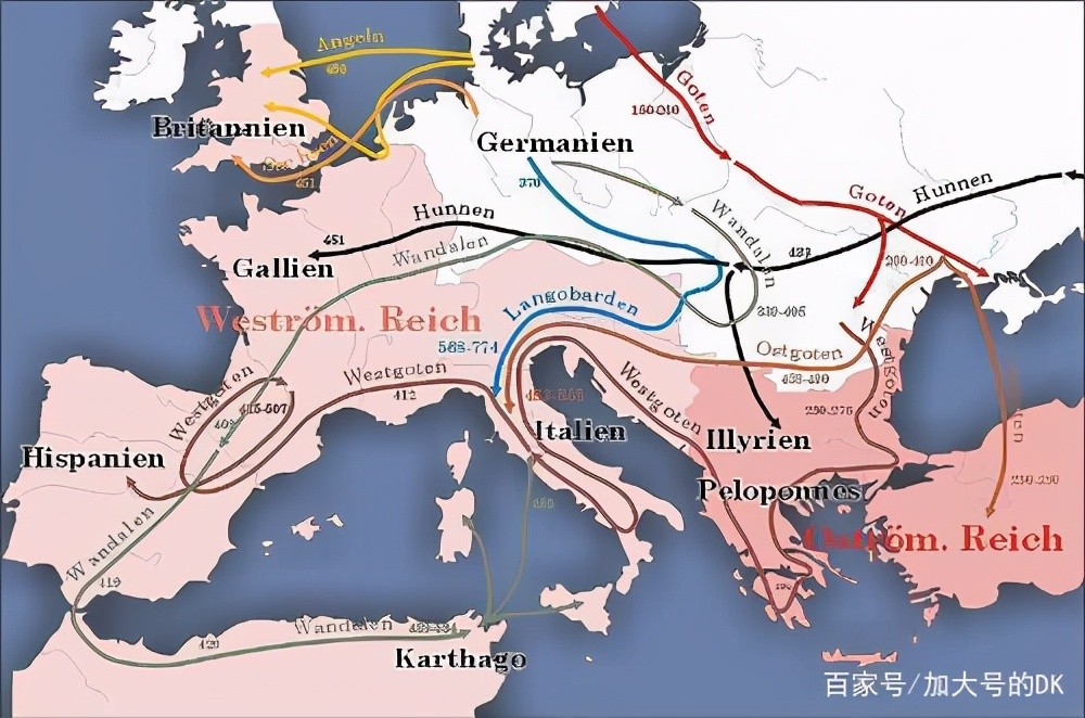 匈奴人还是不满足继续南下和西迁,最终进入了巴尔干半岛,甚至最远时候还打到过罗马城下(不得不说匈奴人太剽悍了),导致曾经已经大规模迁徙的哥特人和日耳曼人接着迁徙,最终他们进入了伊比利亚半岛(今天的西班牙、葡萄牙)和北非迦太基然后还有高卢(今天法国)还有一部分进入不列颠(今天英国)。