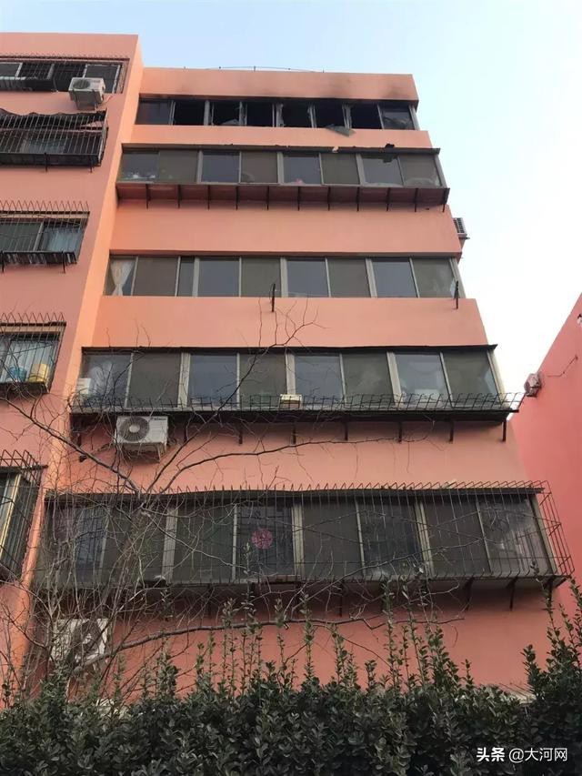 6 楼被大火熏黑的外墙和破碎的玻璃,柏某才杀害全家后从另一侧房间跳窗坠楼身亡。