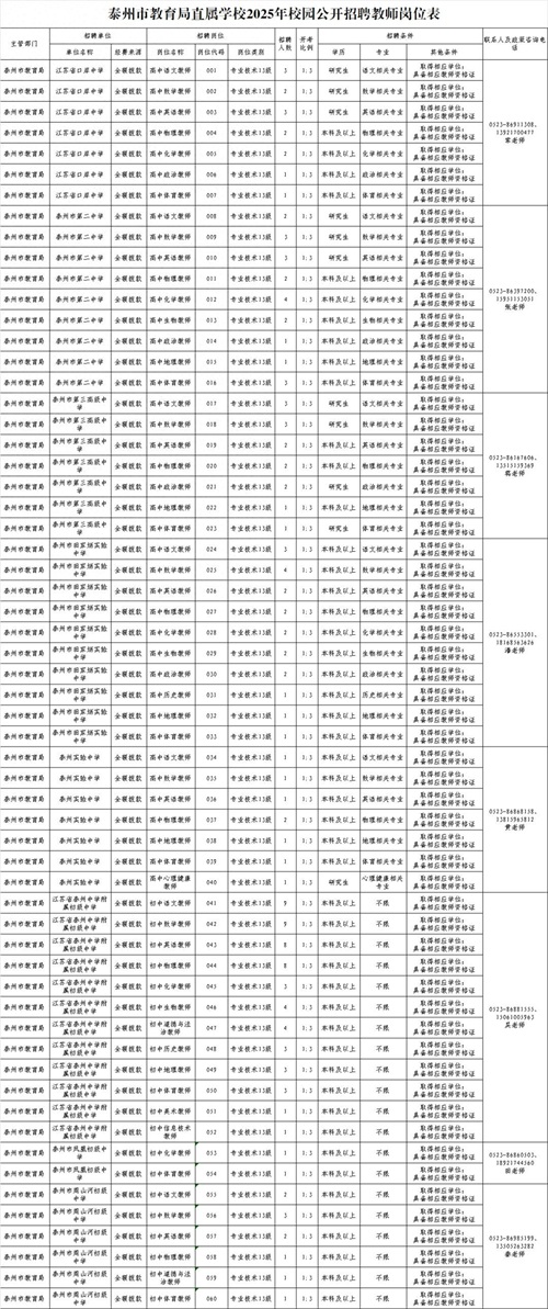 为进一步加强教师队伍建设,根据《江苏省事业单位公开招聘人员办法》《关于进一步做好全省中小学校新进教师公开招聘工作的意见》《关于进一步做好全市中小学教师公开招聘工作的通知》精神,泰州市教育局直属学校将赴相关高校招聘全额拨款事业编制教师145名。现将有关事项公告如下: