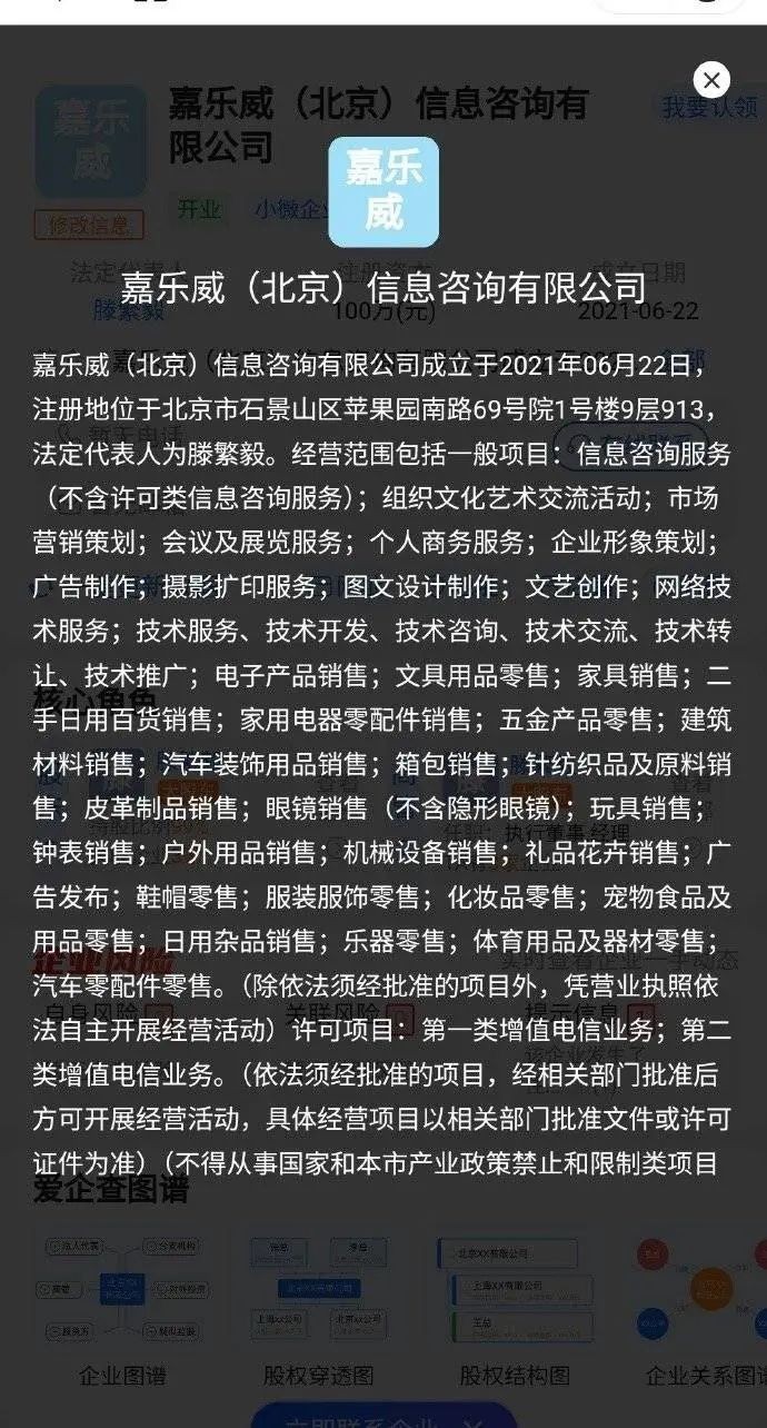 天眼查显示,嘉乐威成立于2021年6月22日,注册资本100万元,法定代表人滕某,公司规模为微型企业,员工人数为1人。该公司曾于2024年4月19日因“通过登记的住所或经营场所无法联系”被北京东城区市场监管局列入经营异常名录,5月17日申请变更登记住所或经营场所后,被北京石景山区市场监管局从经营异常名录中移除。2月19日,记者根据吴先生提供的联系方式,多次尝试联系嘉乐威公司及相关客服,但均没有获得回应。