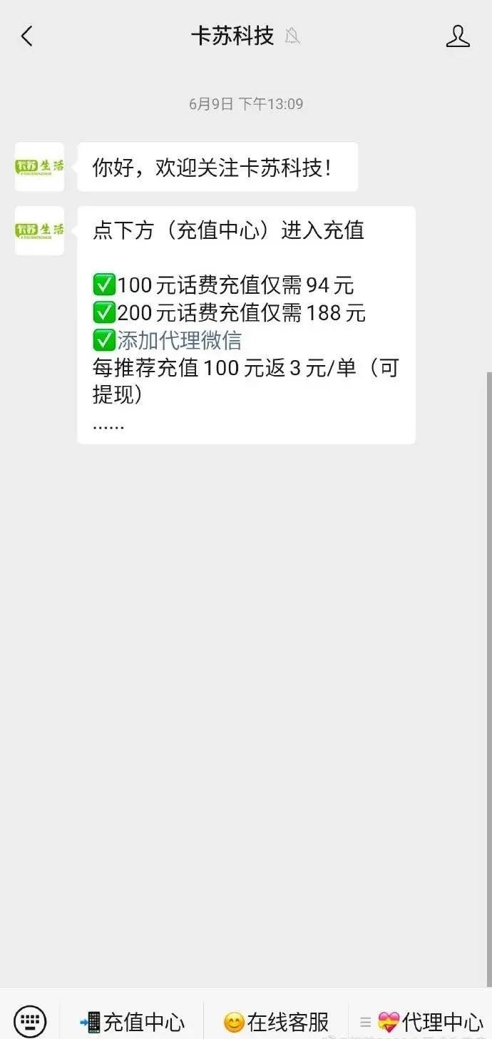 于是,根据提示,他从一个叫“卡苏科技”的公众号,添加了客服微信,对方说,只需要他支付15元,就能成为充值话费的代理,然后就可以给亲朋好友充值,让身边的亲朋也享受优惠。“我当时也是先尝试了给亲戚充值,都充值成功了,就想着可以试一试,反正是小投资嘛。”