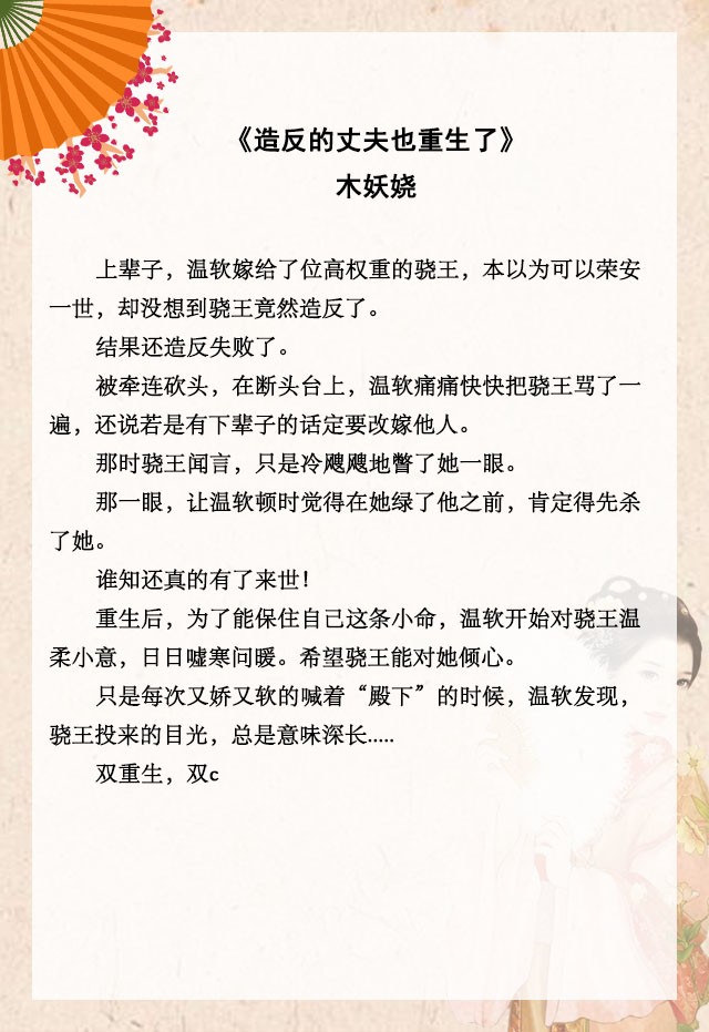 短评:古言双重生甜宠文,温馨甜蜜。前世,女主被继母百般陷害,为了保住弟弟,女主算计得来与男主的婚事,成了王妃。但男主心有深仇大恨,对儿女情长完全不感兴趣,两人只是有名无实的夫妻。不被丈夫重视,没有儿女傍身,女主这一王妃做得很是辛苦,好在她足够聪慧,倒也保全了自己。男主前世被下毒毁了双腿后一直在暗中搞事情,想要谋权篡位,最终失败,连累女主与他一起殒命。