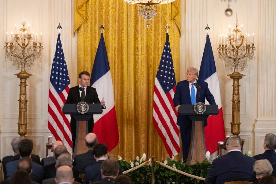 2月24日,美国总统特朗普(右)在华盛顿白宫与到访的法国总统马克龙举行联合记者会。