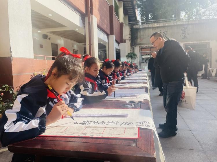 云慧小学党支部书记、校长李艳介绍,学校坚持以书法为龙头的“百花齐放,百花争艳”办学特色,构建“1+N云慧·无边际”课程,以课堂资源、课程融合、项目研究为资源,依托两江新区智慧教育云平台、云慧校园资源平台,实现了书法教育优质资源共享。近年来,云慧小学师生在书法类各项展赛中获奖4000余人次,学校也被评为重庆市书法艺术教育名校。此次学术年会现场,云慧小学师生现场书写,展示书法教育成果,并设置全市中小学师生书法作品联展,供与会人员交流学习。