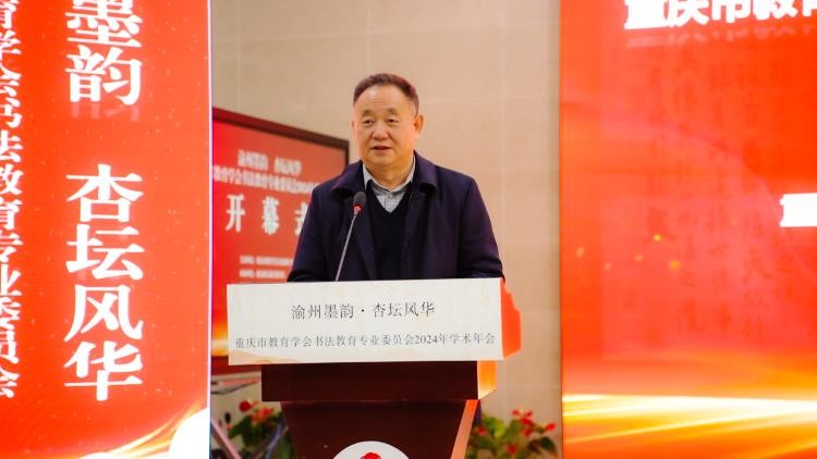 中国书协会员、重庆市政府原副秘书长余恢毅宣布“重庆市教育学会书法教育专业委员会2024年学术年会”开幕