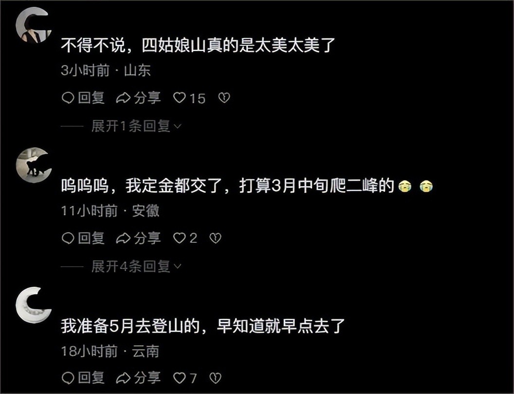 当看到四姑娘山禁止徒步攀登等一切户外活动的消息后,先感到惋惜,因为小编看到有去过四姑娘山景区的网友发布的雄伟壮丽的图片后,本打算去游玩的,但是看到景区客服回应的的信息后便放心了,官方回应:此公告仅限制在全保护区内的一切户外活动(包含登山、露营、攀冰、攀岩等所有户外项目),恢复开放时间另行通知,但景区常规旅游不受影响,考虑到有些游客提前订票规划行程,因此提前10天发布公告。自然保护区封山保育。小编非常理解,毕竟爱护环境,人人有责!