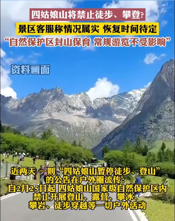 四姑娘山将禁止徒步攀登等活动?