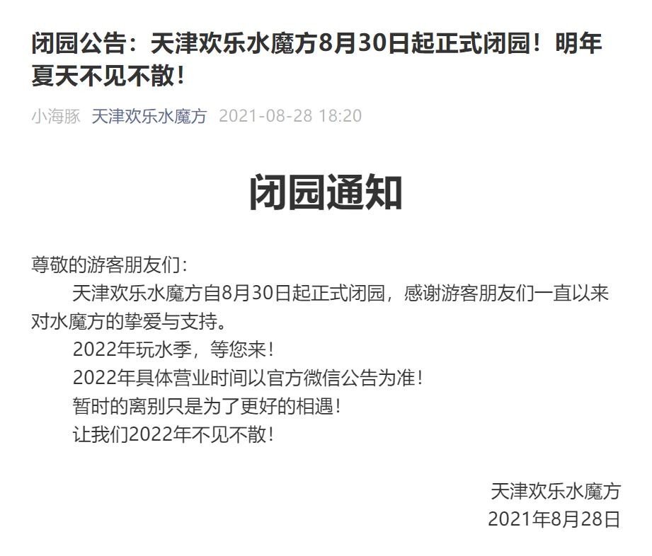去年8月28日,其官方微信公众号发布当年闭园公告,宣布于8月30日起闭园,并寄语“2022年不见不散”。