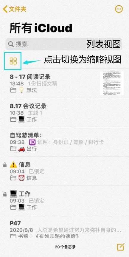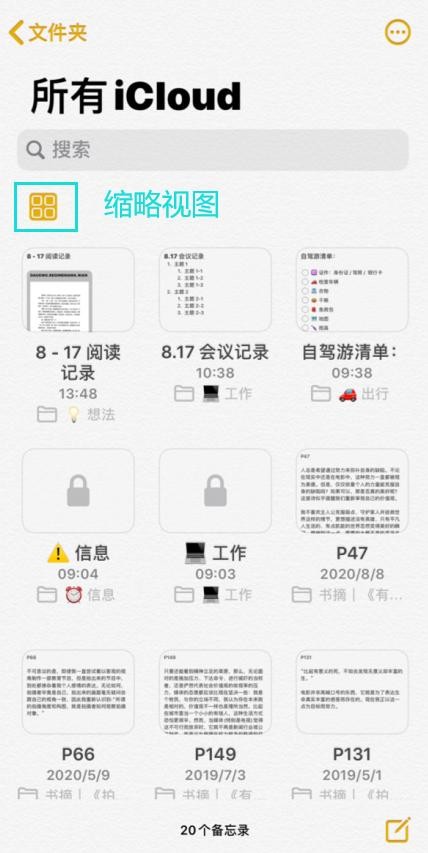 如果点击左上角的排列方式图标,可以切换为“缩略视图”,可以让我们快速地查阅所有备忘录。