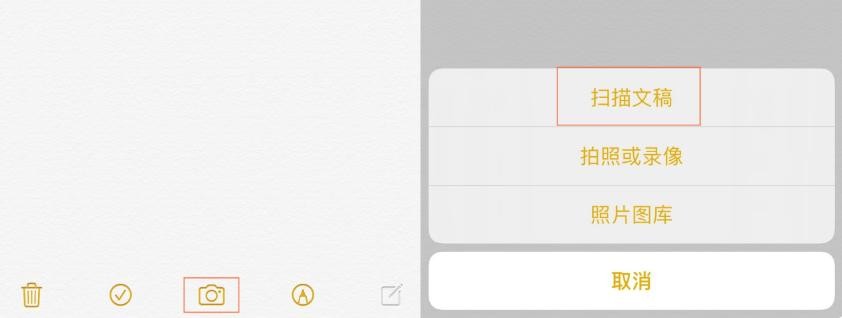 备忘录的相机图标,点开就能看到【扫描文稿】的选项,可以现场拍照提取文字,非常方便。
