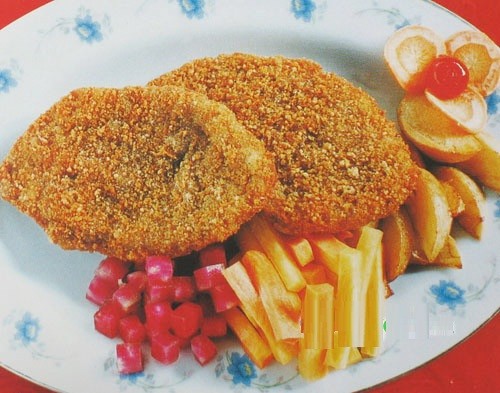 主料:鹿里脊肉180g,面粉50g,面包渣50g,圆葱碎5g,西芹碎5g,鸡蛋1个,炸土豆块5g,苹果3g,煮胡萝卜条10g