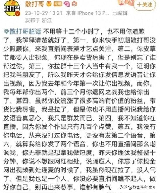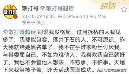 散打哥回应被赵本山女儿球球讽刺,“别说我没格局,过河拆桥的人我见多了,我都能包容,落井下石的人不可原谅,昨天我就给她黑名单了,我不在乎谁家粉丝讨厌我,与其委屈自己,不如为难他人,我喜欢我自己就好了,我也不会管他人想法,不惹事,不怕事。天塌下来我当被子盖,昨天活动圆满成功。 ”