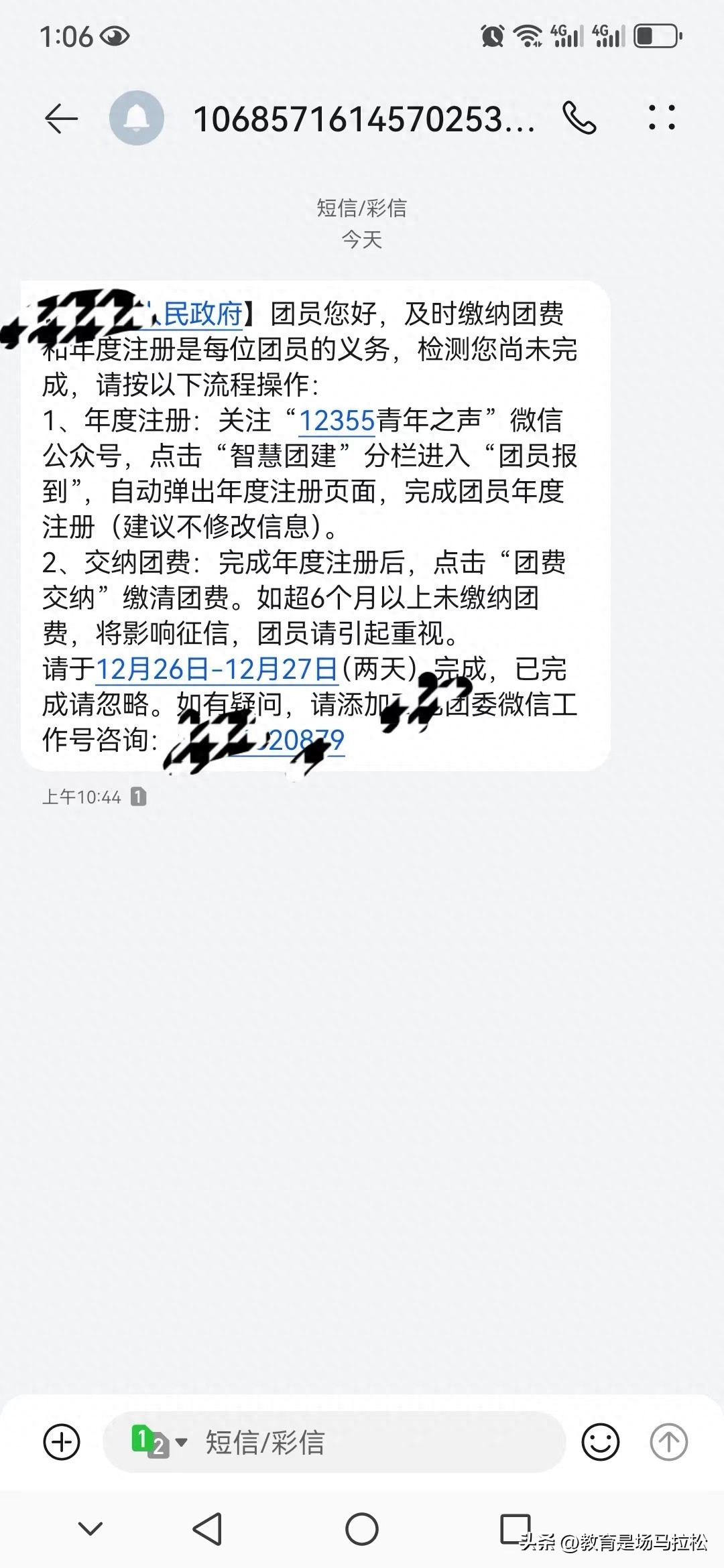 孩子初二了,早上去学校上学了,放在书房的手机,有短信提示音,我跑过去一看,是一条政务短信。温馨提醒孩子按时缴纳团费,逾期6个月没缴纳团费,可能会影响孩子征信。