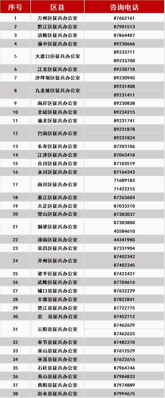 重庆市各区县下半年集中体检即将全面展开(内含体检计划表、征兵办咨询电话)