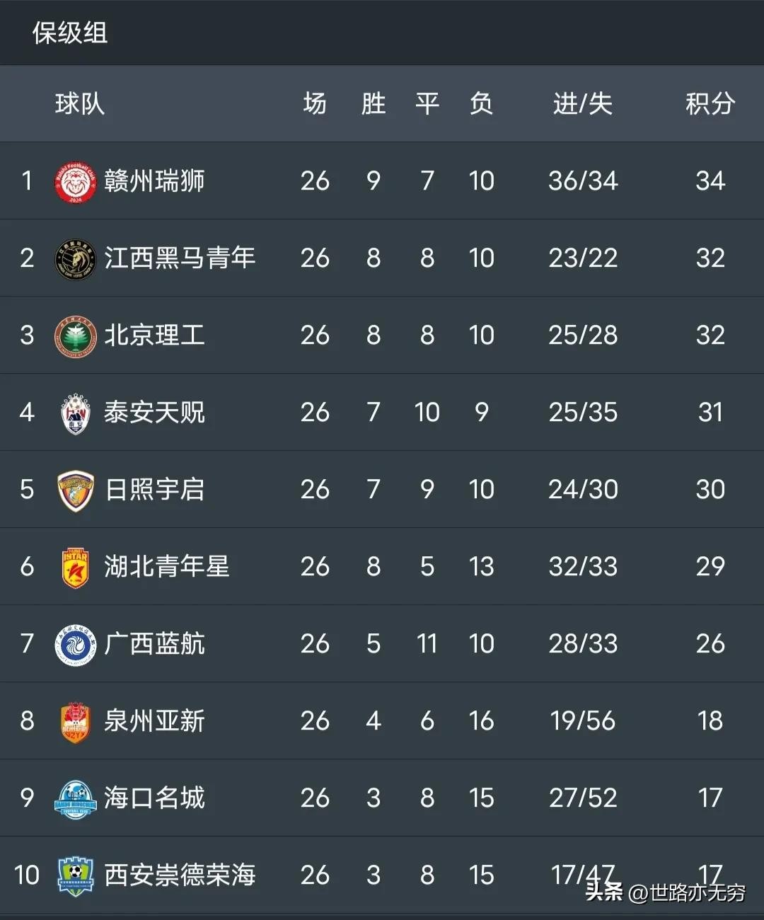 保级组倒数第一的西安崇德荣海队,本轮同样是客场作战,挑战广西蓝航队,目前广西蓝航虽然排名倒数第四,但是积分已经拉开,因此不存在保级问题,所以西安崇德荣海和海口名城境况基本相同,就看两队到时临场发挥了。相信这个时候的西安崇德荣海队,会珍惜每一分获取的机会,相信这场比赛他们不会轻言放弃的。还有一场比赛,泉州亚新主场迎战湖北青年星,泉州亚新目前排名保级组倒数第三,只领先最后两名1分,因此,最后两轮比赛也不能大意,而湖北青年星队则是已经完成保级,因此本场比赛主场作战的泉州亚新队应该不会输球。