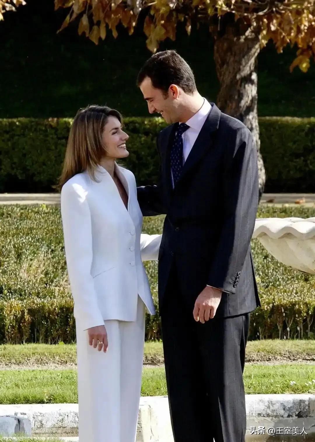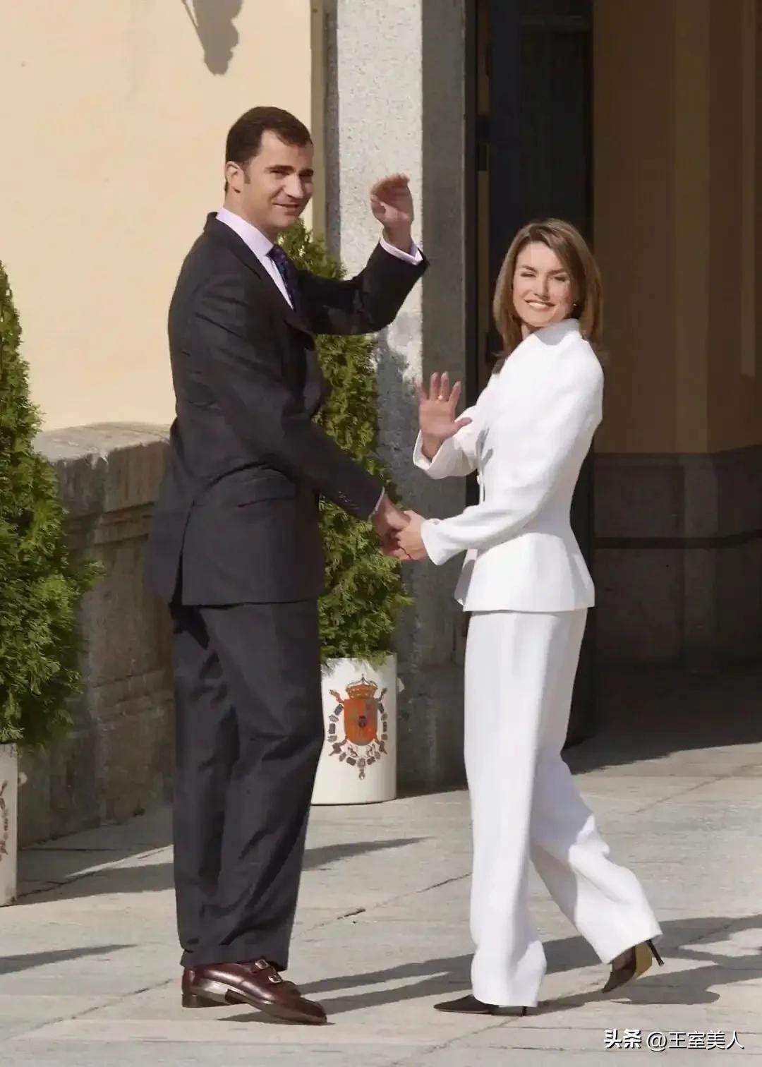 2003年11月,莱蒂齐亚与阿斯图里亚斯亲王费利佩宣布订婚时,就是一套颇具女主播风范的白色小立领西服套装,干练潇洒,风姿卓越。