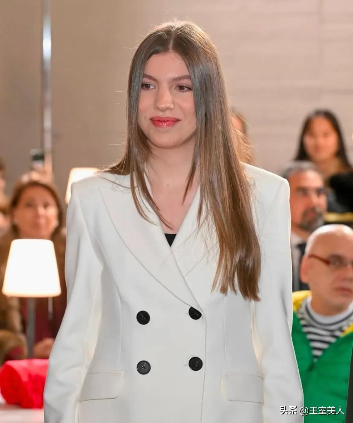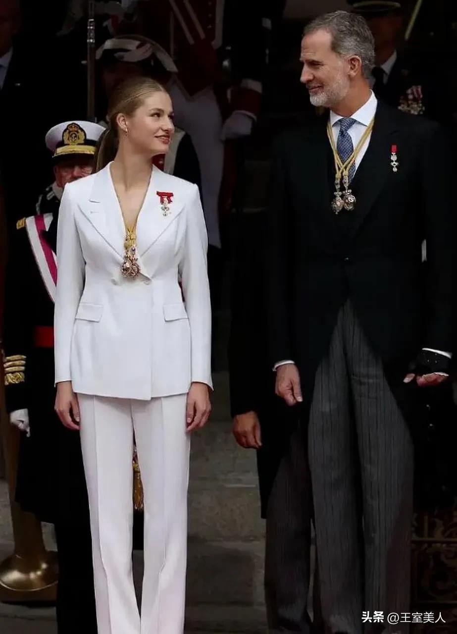 2023年11月,莱昂诺尔公主的成人仪式上,她也是选择一套白色的西服裤装,18岁的女王储既清纯靓丽,又独立庄重,已经能让人预见到未来西班牙女王气场。