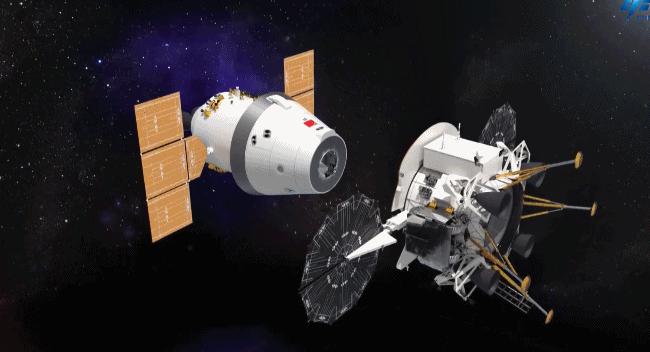 · 两个飞行器在环月轨道进行交会对接,航天员进入着陆器,并由着陆器将航天员送上月面,航天员在月面按计划开展科学考察和样品采集。