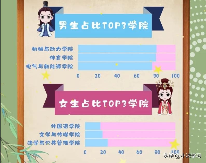女生占比第一学院——外国语学院,男女比1:4.9。其次为文学与传媒学院、法学与公共管理学院。