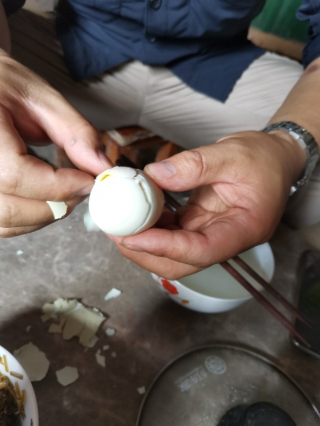 这时水煮鸡蛋也好了,把鸡蛋捞出放入冷水2分钟,拿出来就开始吃了!水煮鸡蛋这种鸡蛋的吃法最原滋原味!五黑鸡的鸡蛋和普通的鸡蛋在口感上就可以最大最明显的区分出来。这种鸡蛋的壳比较硬,剥开后可以看到蛋白非常的水嫩!