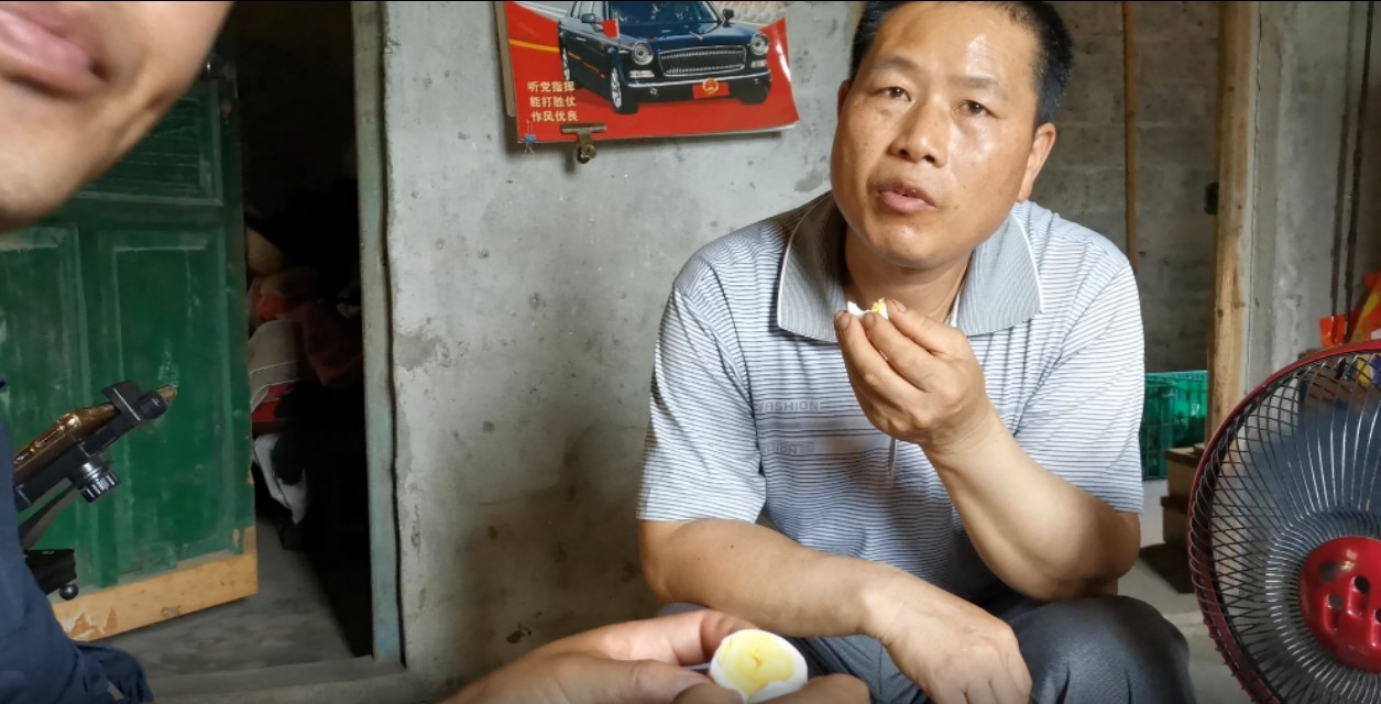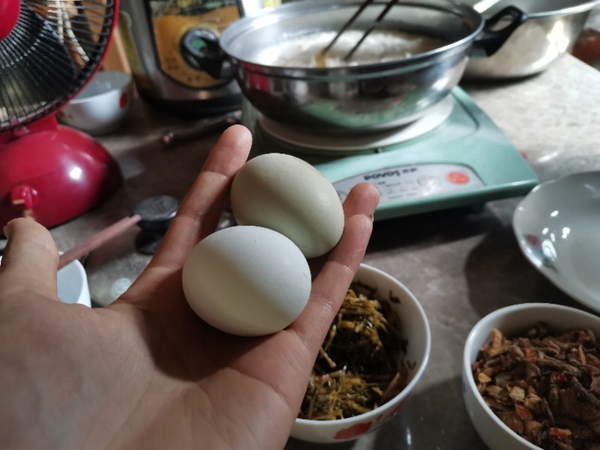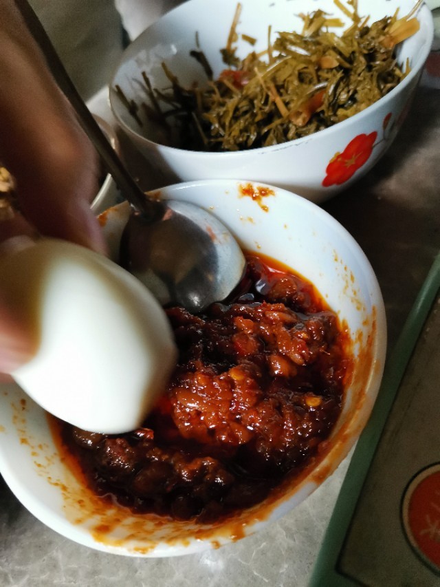 我同事他是桂林人,跟我一起在柳州市区工作,平时就比较习惯味道偏重,他吃不惯这种平淡的味道。然后阿叔拿出了他们自己腌制的农家酸菜,农家黄豆辣椒酱,我同事瞬间胃口大开!拿起一把酸菜和辣椒就往碗里添加,搅拌均匀就大口大口猛吃,看着真有食欲。然后他还一边把剥好的鸡蛋,放入黄豆辣椒酱里面,来回这么搅拌入味,拿起来就是一口一个鸡蛋。特别粗鲁的那种,还说:哈哈哈,这种鸡蛋,就适合这么吃!爽!他一个人就吃了6-7个鸡蛋!