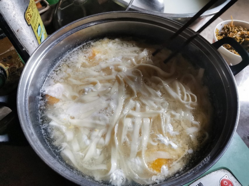 阿叔说这不是鸡蛋坏了,这是“鸡泡泡”就是受精蛋的意思,可以孵化小鸡的。哦豁,瞬间涨知识了都。不过没关系,每天都几百个鸡蛋,都是这样卖的,这样吃的。然后接着倒入面条,在里面搅拌出那种诱人的蛋花。然后再加入油和盐,葱花和青菜什么的就没有了。