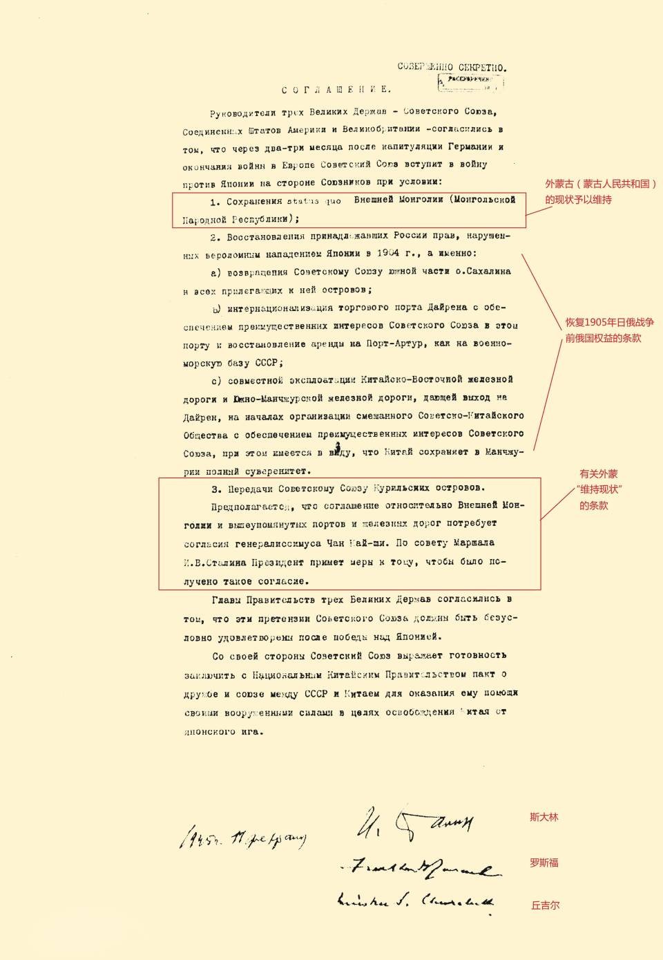 1945年2月4日至2月11日之间,美国、英国和苏联在在黑海北部的克里米亚半岛的雅尔塔皇宫内举行的一次关于制定战后世界新秩序和列强利益分配问题的一次关键性的秘密首脑会议,罗斯福、丘吉尔、斯大林经过讨价还价,签署了全称为《苏美英三国关于日本的协定》的雅尔塔协定,也称“雅尔塔密约”,丝毫未征得中国意见,便强行把中国的国土分割开来。1945年4月12日,罗斯福在佐治亚州的温泉突发脑溢血去世,杜鲁门接任总统。直到6月14日,签约的罗斯福死了2个月,杜鲁门才通知蒋介石雅尔塔会议的内容,随即国民党通知外蒙古代表,承认外蒙古独立。1945年6月27日,中国国民党政府行政院长兼外交部长宋子文偕外交次长胡士泽以及沈鸿烈、钱昌照、张福运、卜道明、刘泽荣等人和蒋介石特派随员蒋经国,由重庆前往苏联首都莫斯科,为签订《中苏友好同盟条约》与苏共领导人斯大林进行谈判。双方经过十次会谈,8月14日,国民政府外交部长王世杰(宋子文已辞去外交部长职务)和苏联政府外交部长莫洛托夫在莫斯科正式签订了《中苏友好同盟条约》及其《关于中国长春铁路之协定》《关于大连之协定》《关于旅顺口之协定》《关于中苏此次共同对日作战苏联军队进入东三省后苏联军总司令与中国行政当局关系之协定》等附件,并互换了关于外蒙古问题的照会等。1952年,中国国民党政府在撤退台湾后,以苏联“违约”为由,向联合国大会提出“控苏案”,并经大会决议通过。1953年2月25日,中华民国外交部宣布正式废除《中苏友好同盟条约》,并否认外蒙古的独立,但大势已去,领土已去成为中国人民心中永远的撕裂伤痛。