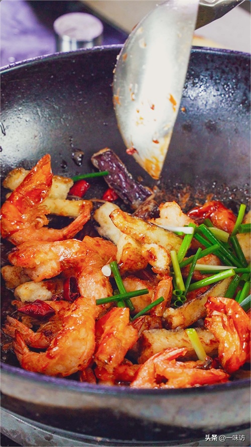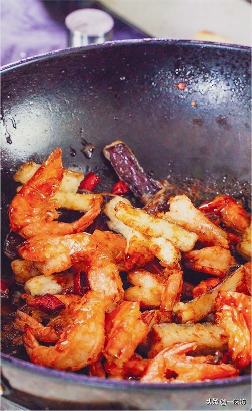 煸炒出香味后倒入碗汁煮至浓稠,然后把虾和茄子同时加入锅中开大火翻炒。