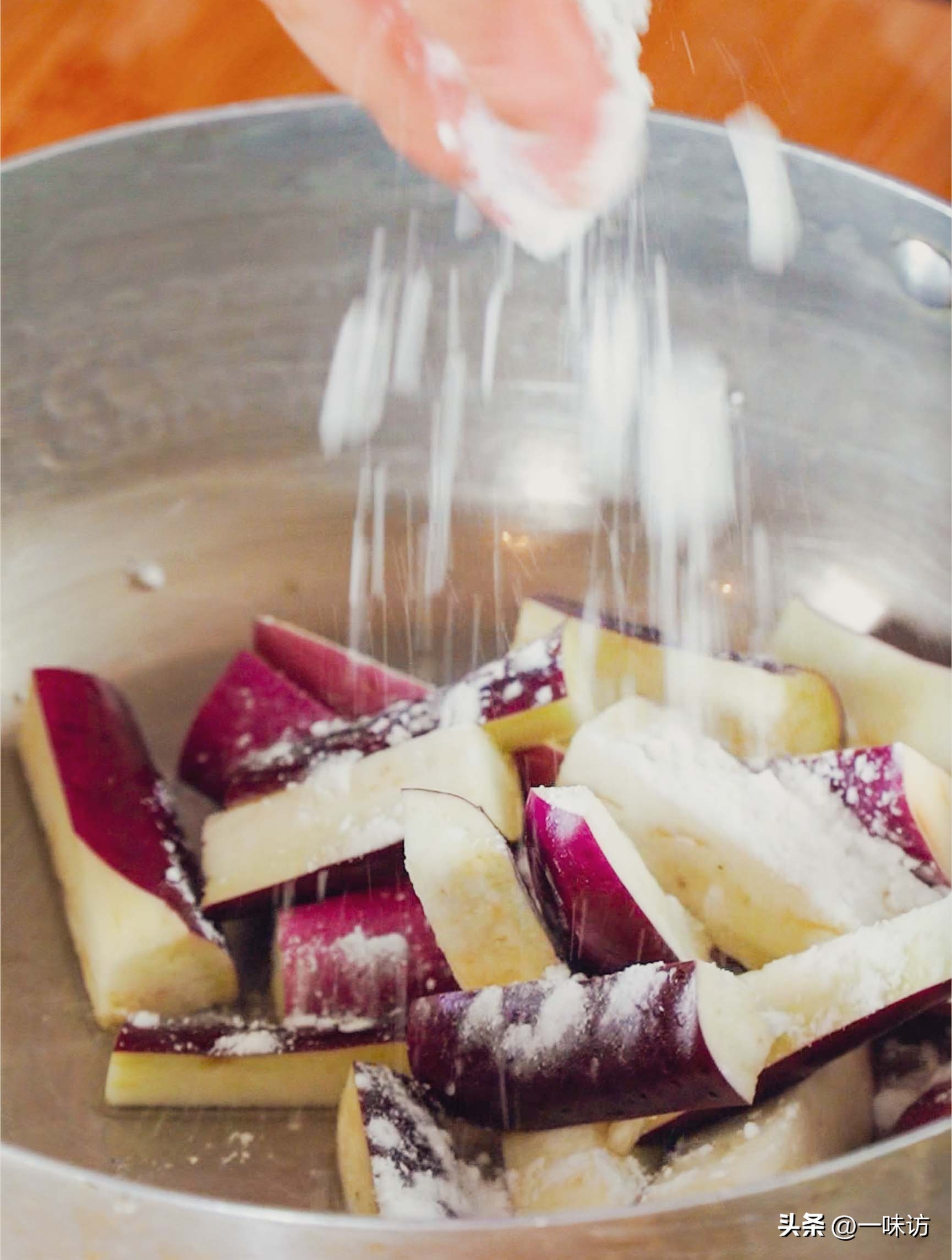 先抓一把玉米淀粉撒在茄子上,然后用另一只手把淀粉和匀让茄子的表面包裹一层薄淀粉。