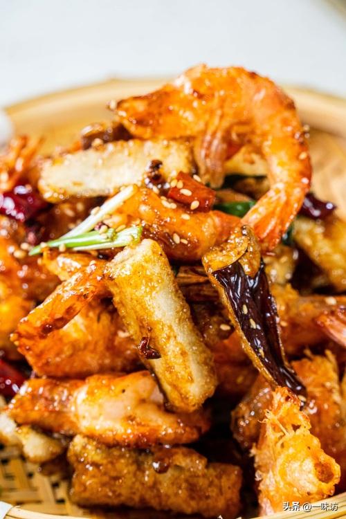 2、茄子和大虾要经过二次油炸,第1次用6成油温多炸一会炸熟。第2次用7成油温快炸至表面酥脆。