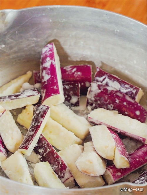 接着我们撒第2遍淀粉,用同样的方法搅拌均匀。最后再来撒一遍淀粉,搅拌均匀后茄子表面就会包裹一层厚的淀粉层。一来油炸之后会发脆好吃,二来能更好的阻止茄子油炸时吸油,保证了口感不油腻。