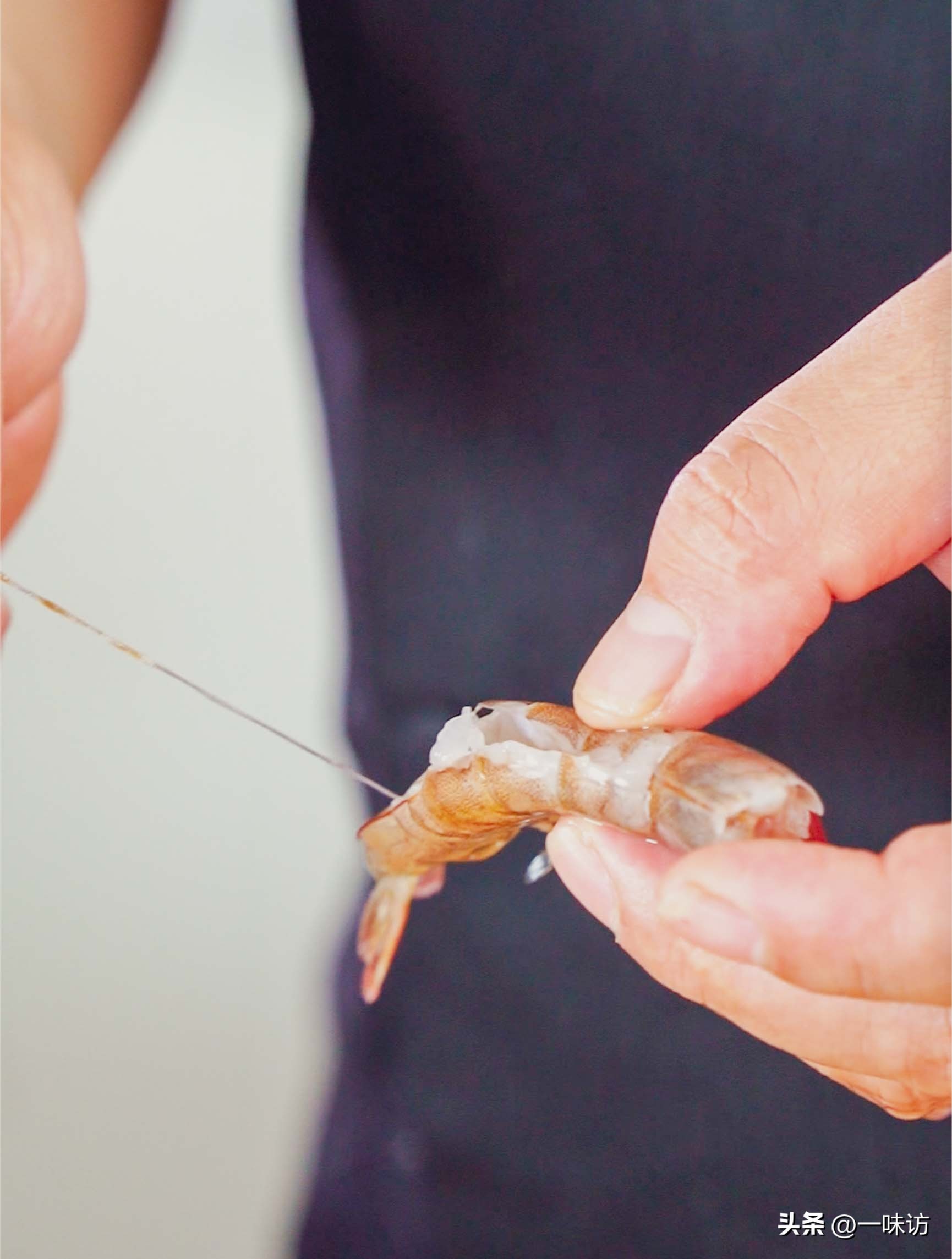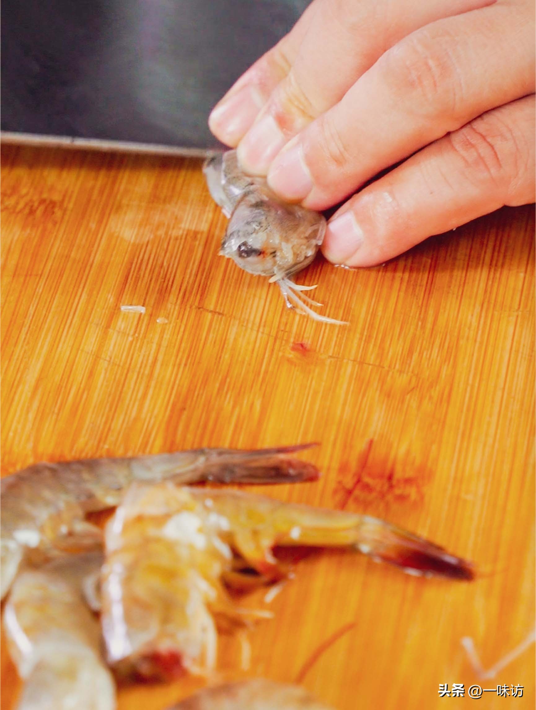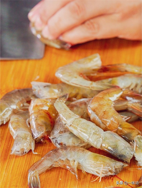 但如果想降低成本,可以用海白虾代替。先把虾放入盆中用清水冲洗一遍,然后放在菜板上用刀去掉头。