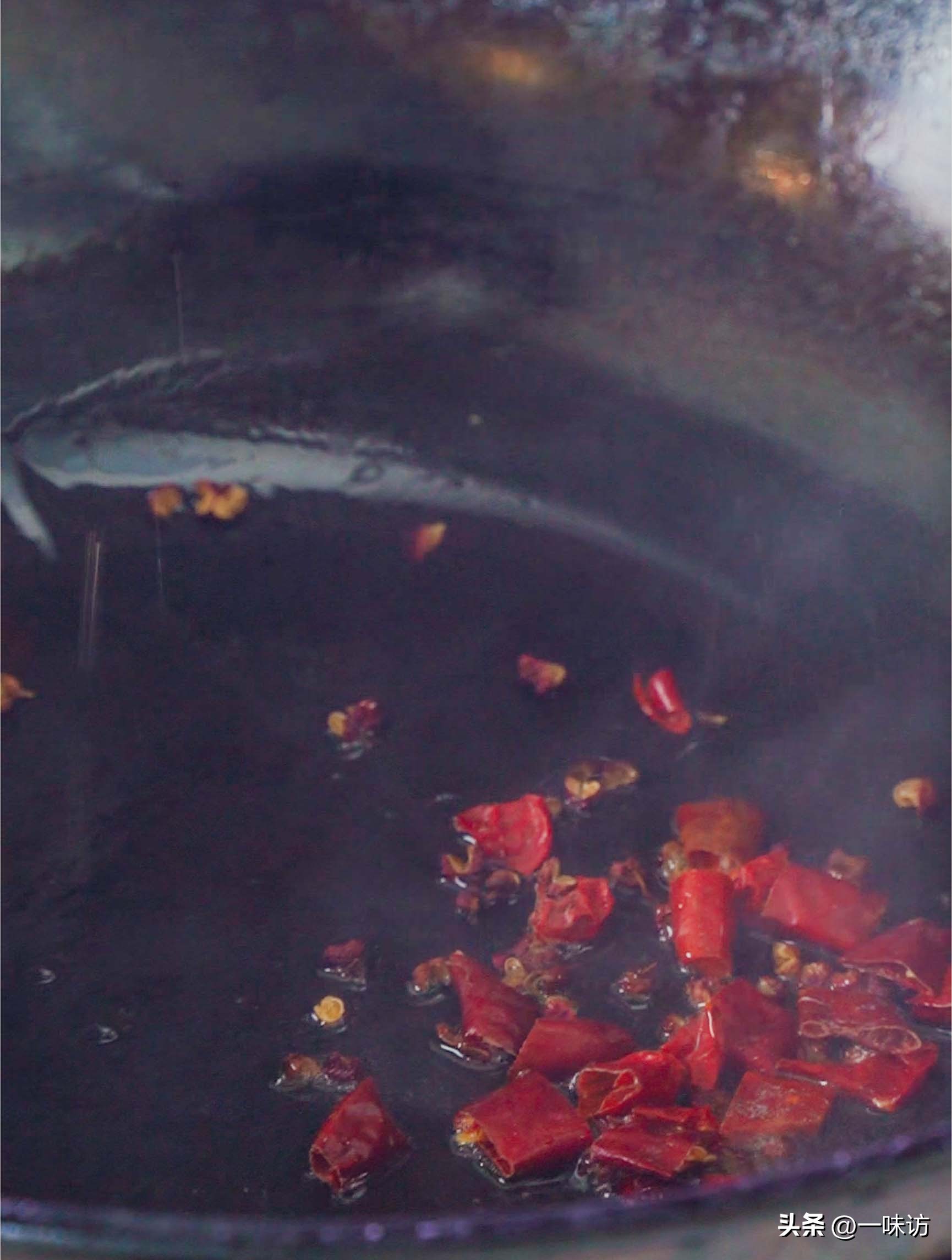 锅中的热油倒入别的容器中,只留下约半汤勺的底油。开火把刚才的油烧热,加入掰开的干辣椒5克和花椒3克,炒香炒酥。