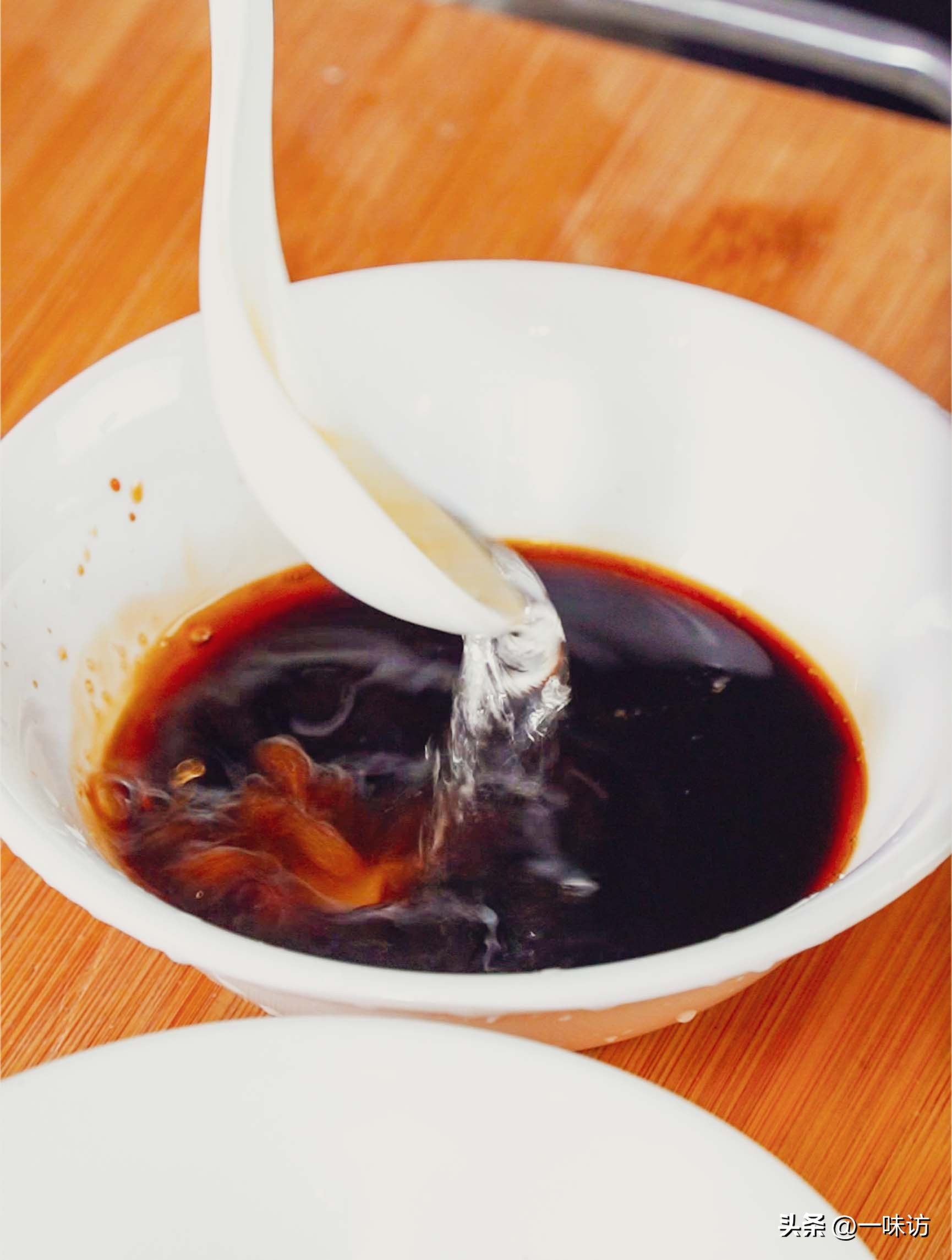 准备一个小碗在碗里放入白糖2勺、醋3勺、盐4克、生抽1勺、清水3勺,搅拌均匀碗汁就调配好了。