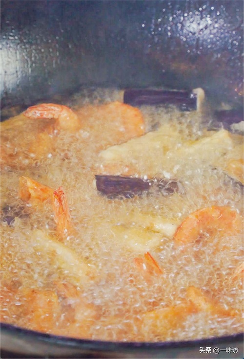 我们同时将茄子和虾下入油锅中快速炸30秒钟捞出,茄子和虾就被炸脆了。