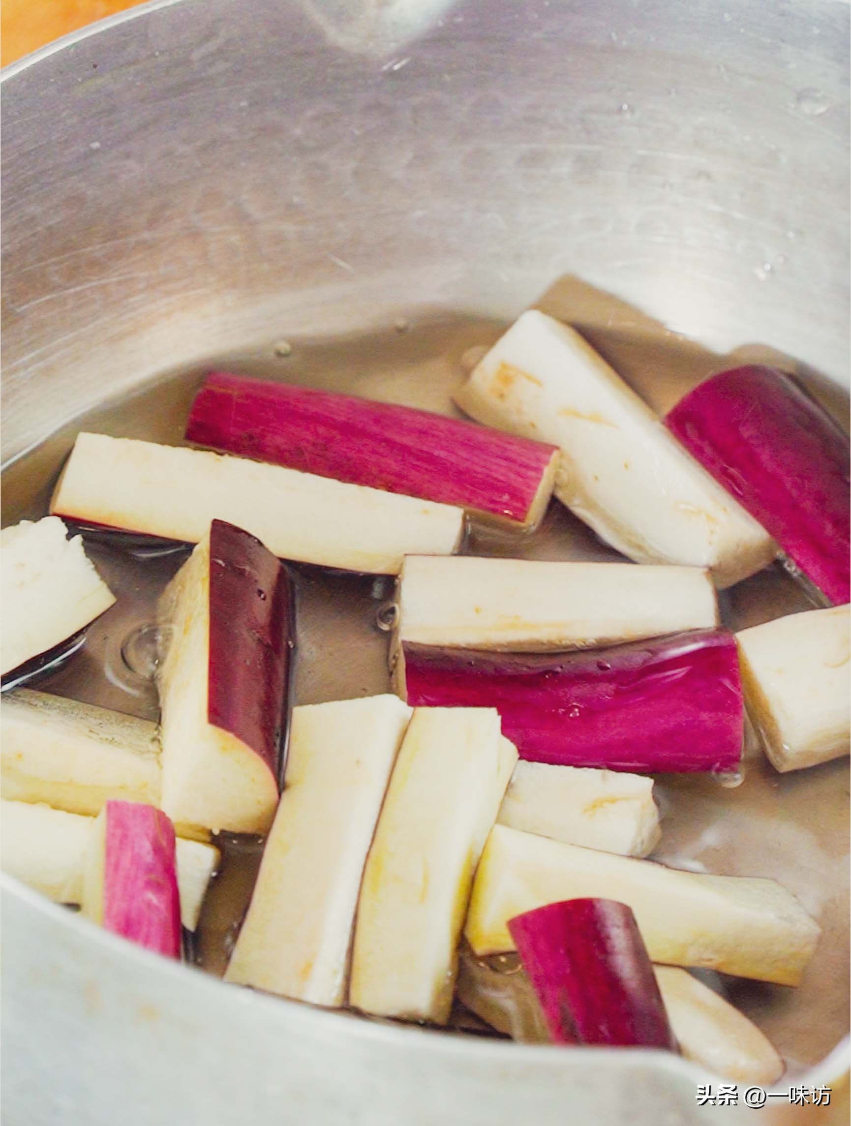 然后再进行对切,之后切成长度适中的段放入盆中倒入清水浸泡。浸泡一会茄子就会吸水堵住孔隙,我们用漏勺把茄子捞出来控一下水放在不锈钢盆中备用。