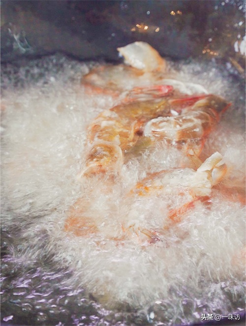 燃气灶的火调小一些,用剩余的油把虾也炸一遍。