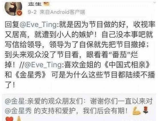 其实关于停播这件事情,金星也曾正面回应过,她表示:“是遭到小人妒忌,小人在作祟,领导怕摊上事为了自保,只好把我的节目给撤了”,由此看来是金星怼人遭到别人报复了,兴许得罪了娱乐圈中有权有钱且有大背景的艺人。因为金星秀将的就是娱乐圈中的艺人的事情,得罪了人没错了。