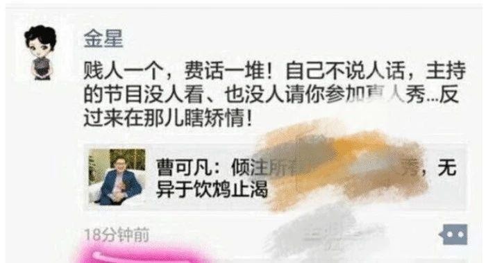 后来又有网友爆料:是东方卫视的另一名主持人曹可凡作祟,并且两人积怨已久。曹可凡很早之前抨击电视圈都被真人秀搞浑浊,更直言真人秀节目无异于引鸠止渴,一时的红压根不能长久!金星看不惯这样的评论直接正面回怼曹可凡:“贱人一个,废话一堆,自己不说人话,主持的节目没人看,也没人请你参加真人秀,反过来,在那瞎矫情”,就是这一段话真的不留情面,兴许就是这句话结下了梁子吧。但是曹可凡的实力也撵不上金星啊?