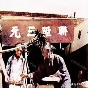 清朝末年拍摄的照片,一位看起来年龄已经非常大的奶奶正在购买东西,这位老奶奶的身高非常高。