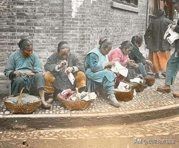 晚清的市井街头,几位头发花白的老太太正专注于手中针线活计。她们以这样的方式挣取微薄收入,艰难维系着生活,让人感叹岁月艰辛。