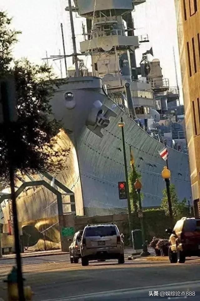 温斯康星号静静停靠在海边,其庞大的身躯散发出一种强烈的压迫感。