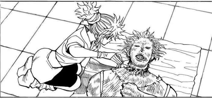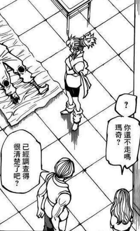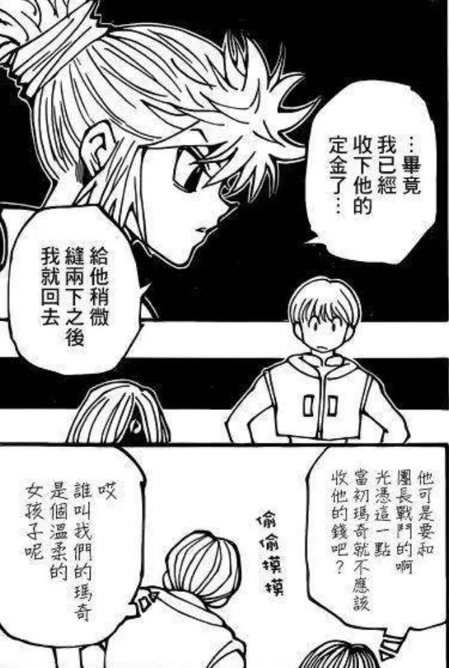 在确定西索死透以后,玛奇找了个借口留下来想为西索缝一缝,侠客和酷毙看破不说破,悄悄低估几句就先离开了。这里也体现了玛奇温柔的一面。