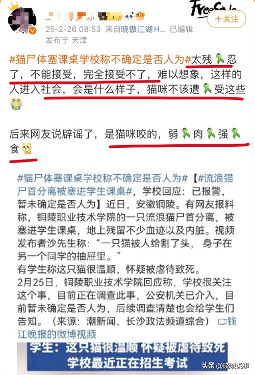 事件发酵48小时内,舆情经历了三次剧烈反转。最初"流浪猫遭分尸"的词条冲上热搜时,评论区充斥着"严惩变态"的愤怒声浪。当校方通报"非人为"结论后,5.2万条质疑涌向官微:"难道猫会自己分尸藏匿?"直到完整监控视频公布,仍有34%的网友坚持"监控被剪辑过"。