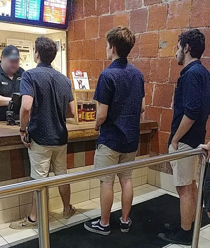 07.这三个人怎么会穿一样的服装在这家快餐店排队。