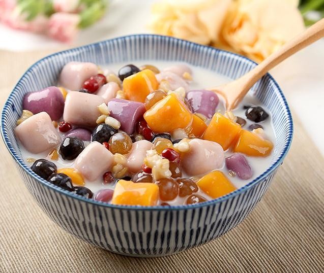 5.用一个空碗放入糖粉、纯牛奶,放入过凉的芋圆,再入点自己喜欢吃食物,搅拌几下就可以开吃了。