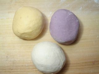 2.将蒸好的紫薯、南瓜、芋头依次放入碗里,按压成泥,再分别放入木薯淀粉,搅拌均匀后,用手揉成团,放在一旁备用。
