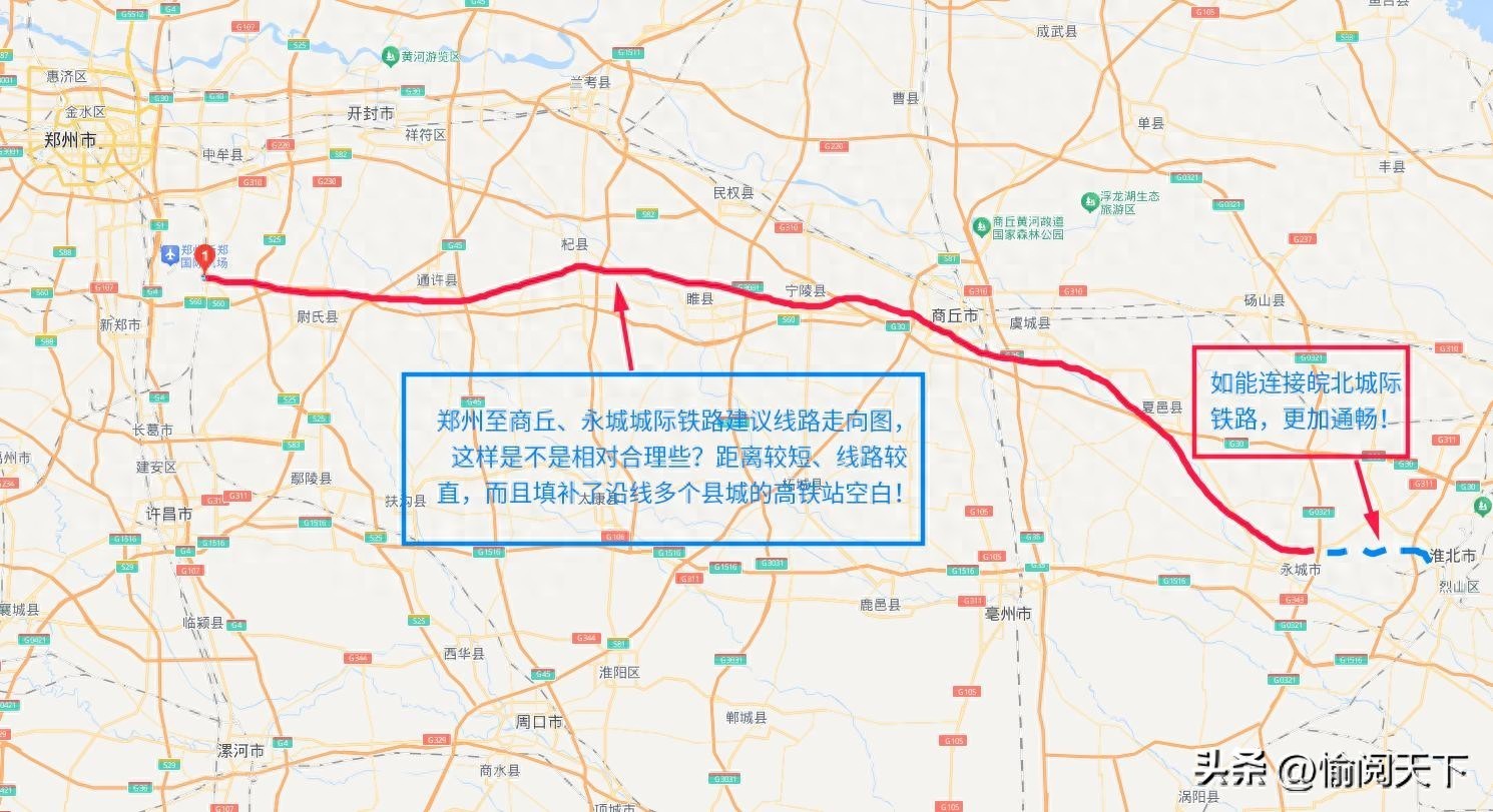 结合河南省中部、东部地区既有铁路线路情况,个人认为最合理的线路走向应该是从郑州航空港高铁站发出,一路往东经河南省尉氏县、通许县、杞县、睢县、宁陵县(县城,而非宁陵县柳河镇)、商丘市、虞城县、夏邑县,最后到河南省永城市(城区,而非永城市芒山镇),并且可以加强与安徽省的沟通对接,继续往东延长至安徽省淮北市,进而联通安徽省规划建设的皖北城际铁路网(目前皖北城际铁路正在快速建设当中,河南省永城市紧邻安徽省淮北市,两个城区之间距离不过三四十公里,非常近)。